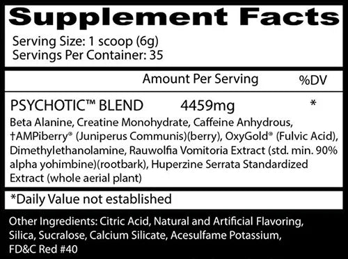 Psychotic es un suplemento a base de estimulantes que se utiliza 20 a 30 minutos antes del entrenamiento. Está cargado con varios ingredientes de alta potencia que han demostrado ofrecer múltiples beneficios para el rendimiento físico, incluyendo mayor energía, aumento de la fuerza y resistencia intensificada.